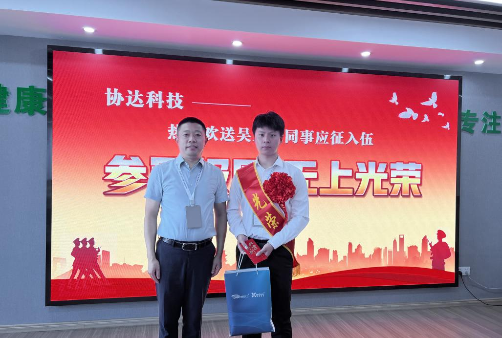 最后,陳總表達(dá)了對(duì)他殷切的希望,期望他不負(fù)囑托、努力拼搏,在軍營里譜寫出無悔壯麗的青春!并承諾協(xié)達(dá)的大門永遠(yuǎn)為你們敞開,公司將保留入伍員工的崗位,退伍之后可隨時(shí)回崗,協(xié)達(dá)期待你們?cè)缛樟⒐Φ南灿崳?/span>
